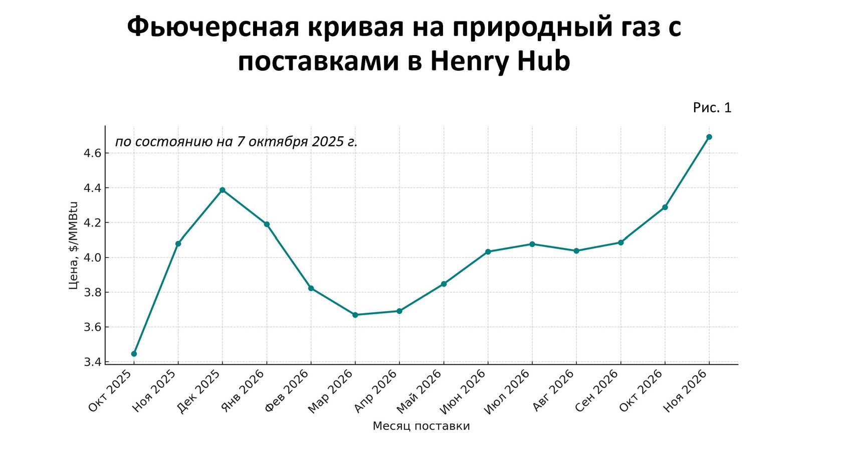 Осенью 2025 года американский рынок природного газа демонстрирует именно такую картину. Фьючерсная кривая на хабе Henry Hub имеет отчетливо восходящий профиль (см. рис. 1). Спотовая цена колеблется в районе $3 за миллион БТЕ, октябрьские контракты торгуются примерно по $3,5, а декабрьские достигают $4,4. Таким образом, зимние поставки стоят почти на треть дороже текущих, и это одно из самых выраженных контанго последних лет.