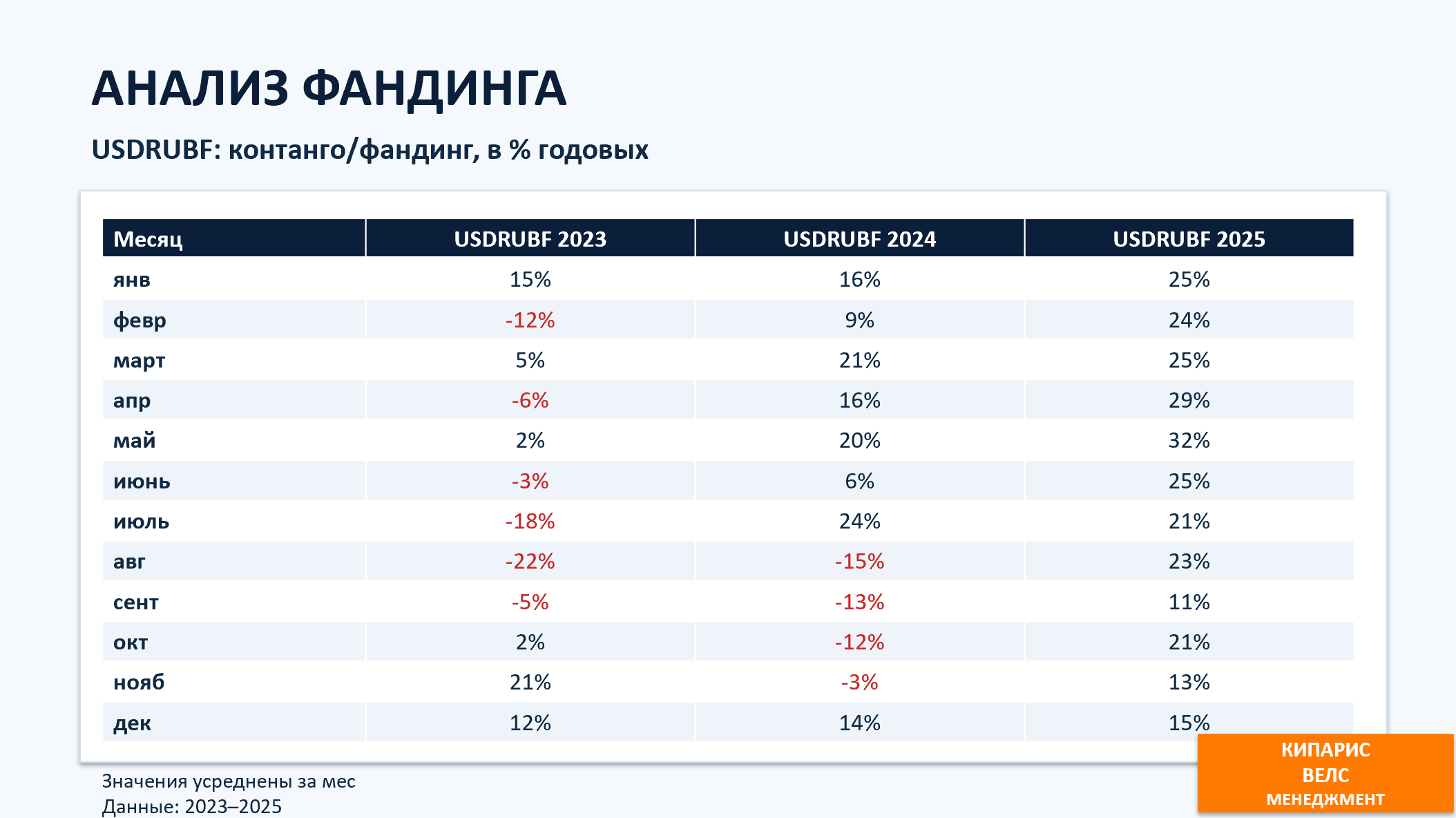 То есть в 2025 перенос позиции по USDRUBF в среднем оставался структурно положительным большую часть года.